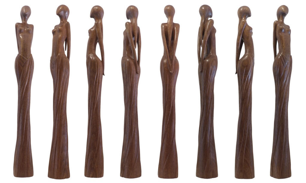 Cette sculpture « Rêveuse » est en Niové. Série « La Femme Debout en Poésie », fière et en élégance.